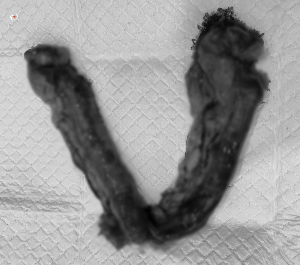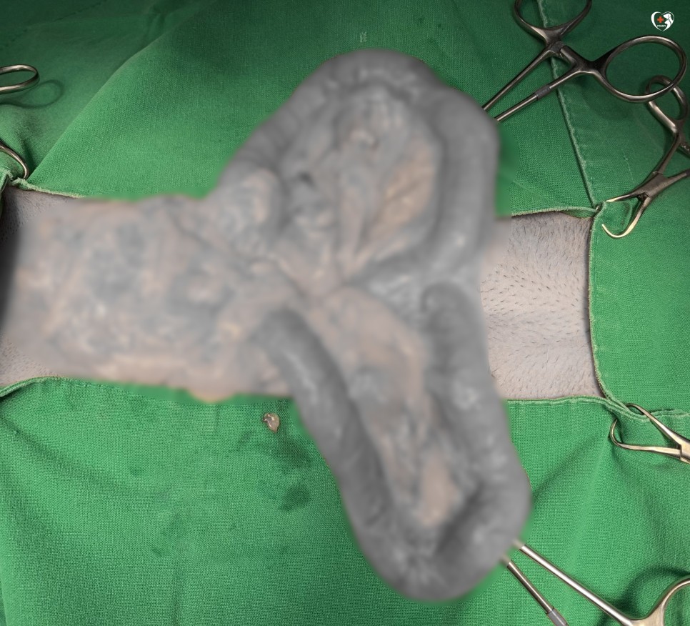 오른쪽 사진을 보면 자궁이 크게 펼쳐져 있고 검은 부분이 잘려져 있군요?자궁축농증으로 인해 커진 것으로 확인되었습니다.