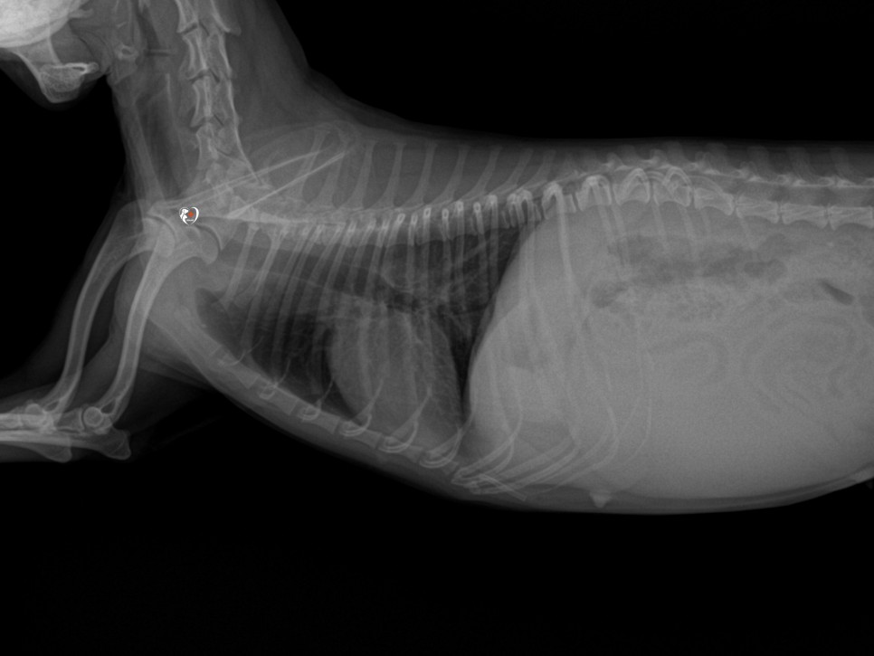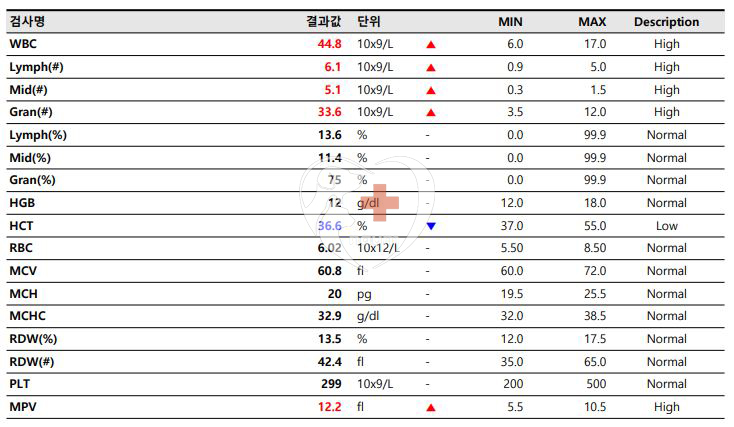 흉복부 X선 검사 결과는 양호했지만, 혈액 검사 상 빈혈 관찰이 되어 수혈을 먼저 한 후, 개의 자궁 축농증을 진행할 수 있었습니다.