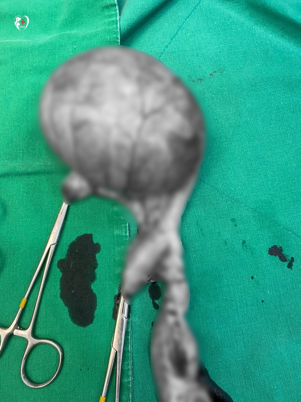 개복을 하고 확장된 자궁을 복강 밖으로 내보내 보았습니다.