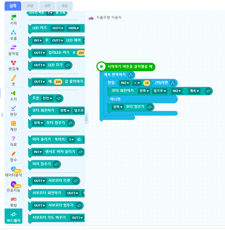거리센서(IN2) 값이 10보다 크면 스마트카가 출발하고 거리센서(IN2) 값이 10보다 작으면 장애물을 감지해 스마트카가 정지함을 나타냅니다!