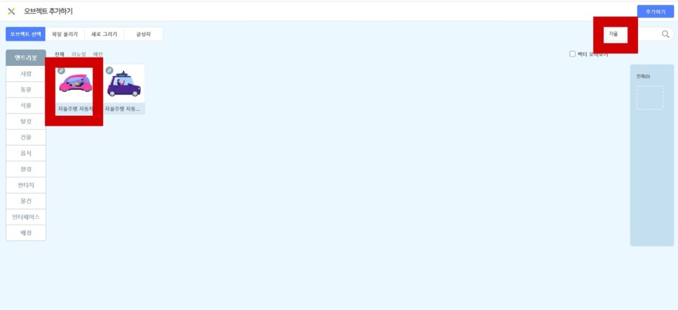 그 다음 ‘자율주행차’ 검색 후 ‘자율주행차’ 객체를 추가한 후 우측 상단에 있는 추가 버튼을 누르세요!
