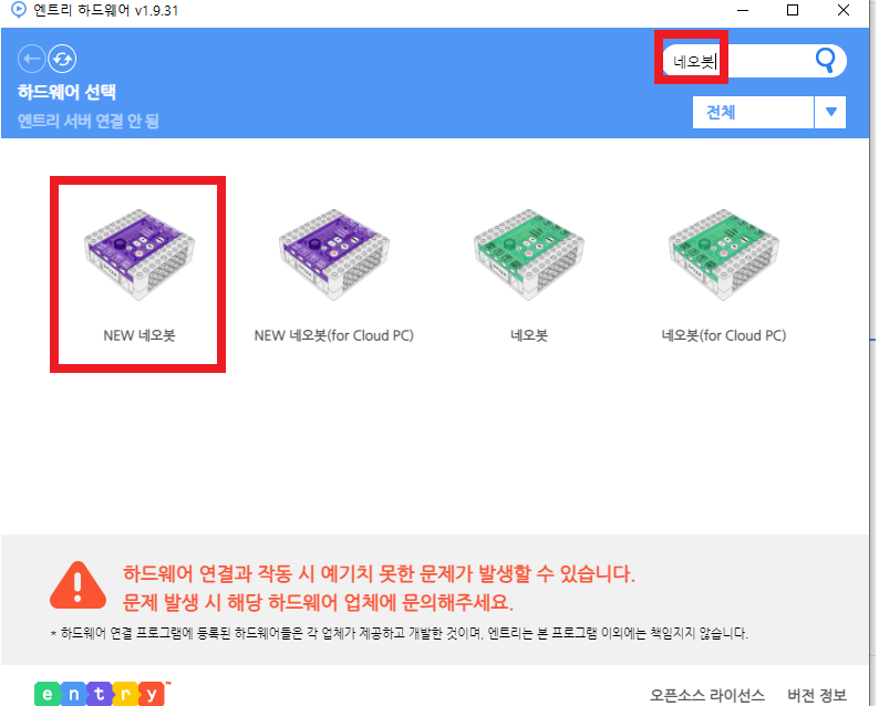 하드웨어에 네오봇 검색 후 NEW 네오봇에 접속하세요.(*엔트리 하드웨어는 항상 최신 버전으로 설치해주세요!)