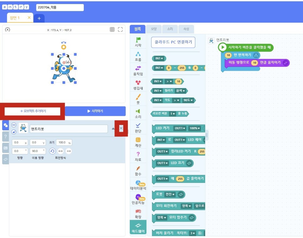 기본 엔트리 봇 오브젝트를 삭제하고 오브젝트 추가를 클릭하십시오.