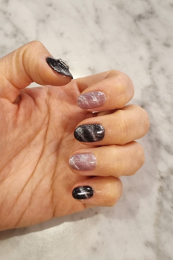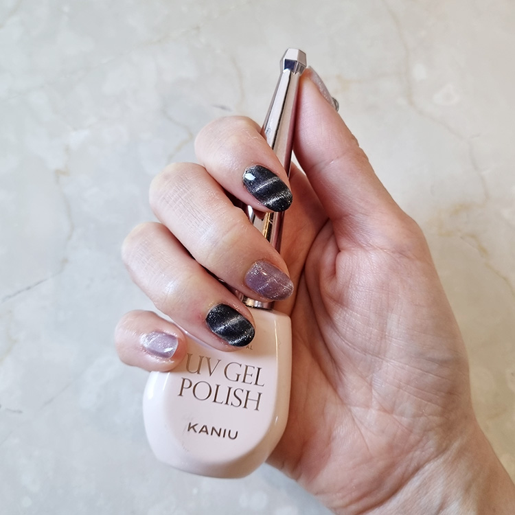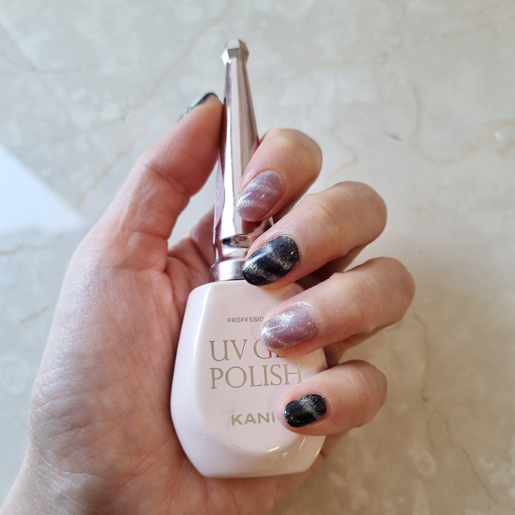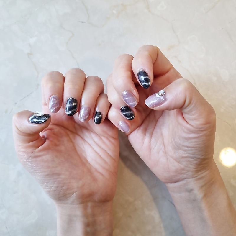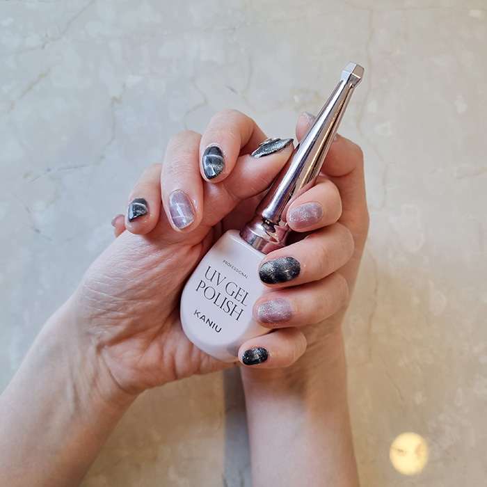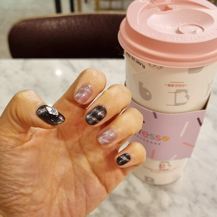 손톱을 움직이는 각도에 따라 펄의 분포(?)가 조금씩 달라보이는데..이게 또 마그넷 네일의 묘미라고 생각해요!!