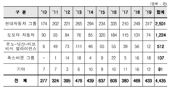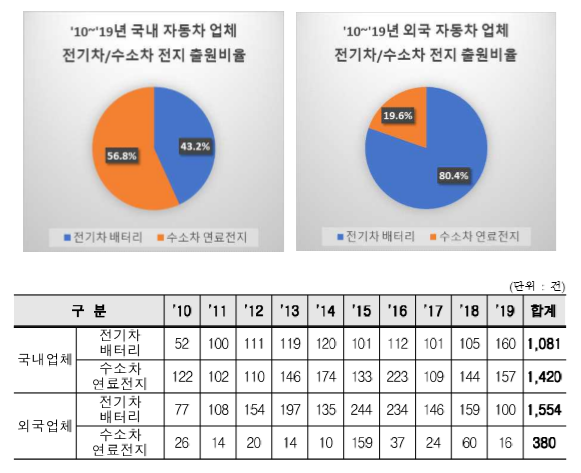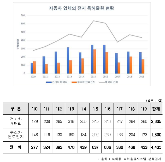 (출처=특허청, e-patent new s)특허청에 따르면 자동차회사의 전지 관련 특허출원은 2010년부터 2019년까지 총 4,435건으로,