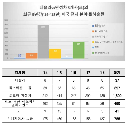 배터리 관련 업체별로 평균 696건의 특허출원을 했으나 테슬라는 37건의 특허출원에 그쳤지만,