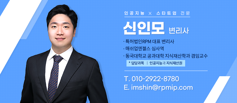 신인모 변리사 약력- 특허법인 RPM 대표변리사- 매쉬업엔젤스 심사역- 동국대학교 지적재산학과 겸임교수 (인공지능 지적재산권 분야 전담)