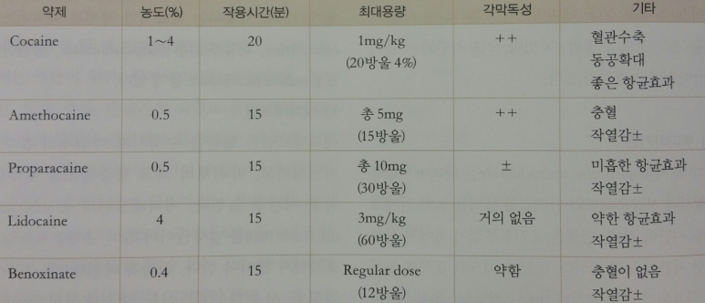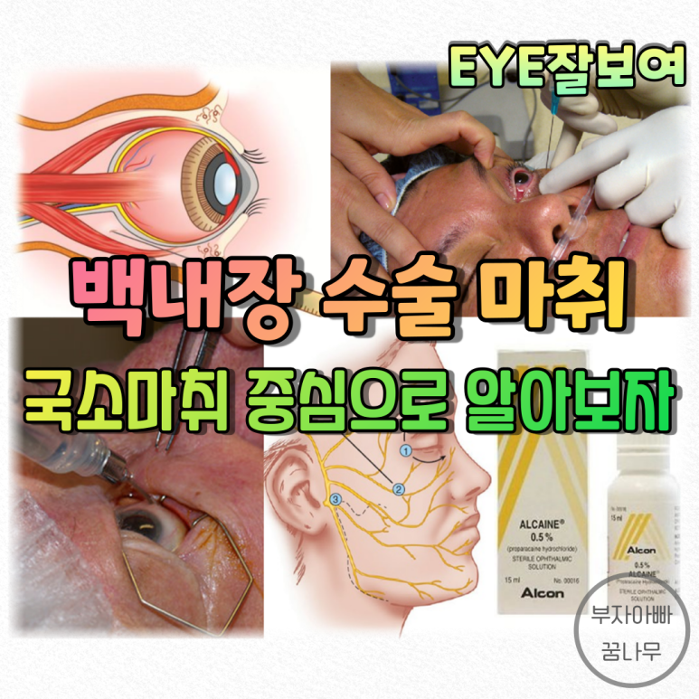 백내장 수술은 보통 1시간 이내에 마칩니다. 보다 안전하고 원활한 수술을 위해서는 마취가 필수적이다.오늘은 백내장 수술에 사용하는 마취에는 어떤 것이 있는지 공부하고 싶다.1. 국소 마취 vs. 전신 마취 국소 마취로 진행하고 전신 마취를 진행할지 선택하는 것이 우선이다. 각각의 장점과 금기를 보면 국소 마취와 전신 마취의 장점, 국소 마취 전신 마취 ① 방법이 단순 기구가 간편하고 비용이 저렴하② 수술 후 오심 또는 구토 적고 회복이 빠르다.③의 수술 후에도 일정 시간 진통 효과 ④ 호흡, 인지, 간, 심혈관 기능 등에 영향이 없다.① 환자를 완전히 통제할 수 있다.② 눙도우이 출혈 안구 천공의 위험이 없다.③ 기술적으로는 모든 나이에 가능하다.국소 마취와 전신 마취의 금기 국소 마취 전신 마취 ①, 국소 마취제 과잉 반응 이력 ② 마츄이쟈의 미숙련 ③ 2시간 이상의 긴 수술 ④ 10세 이하 소아 ⑤ 신경 정신 질환자-정신 지체, 노인성 치매, 파킨슨 병 ⑥ 조절되지 않는 기침 ⑦ 곧바로 눕지 못하는 질환을 갖고 있는 상태 ① 환자의 거부 ②, 전신 마취로 인한 심각한 합병증 예상되는 환자 ③ 기도의 유지가 어려운 환자와 폐 질환 등 ④형 심근증 ⑤ 헤모글로빈 병 ⑥ 심각한 당뇨 ⑦ 항응고제 사용 2. 국소 마취제, 국소 마취제는 독성의 상승 작용은 미미하고 작용 시간 및 발현 시간을 고려하고 혼합하여 사용하는 것이 일반적이다.리도카인(Lidocaine)*1-4%농도로 사용(작용 시간이 짧은 것이 단점-에피네프린 추가하면 작용 시간 75%정도 연장 카눙메피바칸(Mepivacaine)*리도카인과 임상적 효능, 독성이 비슷하지만 작용 시간이 50%가량 더 길다.*리도카인과 달리 점안 마취는 효과가 없다.부피 바카인(Bupivacaine)*0.25-0.75%농도로 사용*메피파카잉을 지질 용해도나 단백 결합 능력을 높이고 개량, 작용 시간이 길다.(에피네프린에 연장되지 않을 것)*조직 삼투성이 낮은 작용이 발현할 시간이 더디다.에티도 카인(Etidocaine)*리도카인의 작용 시간을 연장+브피파카잉의 작용 발현 시간을 단축(체적 바보라고 마찬가지로 수술 후 복시가 24시간 이상 지속될 수도 있음의 부가적 약제들#에피네프린*마취제의 흡수를 지연+마취제의 최고 혈중 농도를 낮추는 작용 시간 연장(농도는 5㎕/㎖(1:200,000) 넘지 못하며 총량은 0.2㎎ 넘지 않아야 함.보통 0.05㎎ 사용(물 20㎖에 1:1,000에피네프린 0.1㎖혼합)#히알루로니다지에(Hyaluronidase)*국소 마취제가 조직에 침투되도록 촉진과 없는 조직의 아교질 결합을 분해하고 마취제가 잘 퍼지게#점안 마취제(그림 1)최근, 점안 마취가 수술할 트렌드이다!