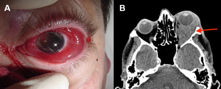 그림3. (A) 구후출혈, (B) C T (axial view)를 통해 구후출혈을 확인할 수 있음 – 구후출혈로 인해 안구가 돌출된 상태