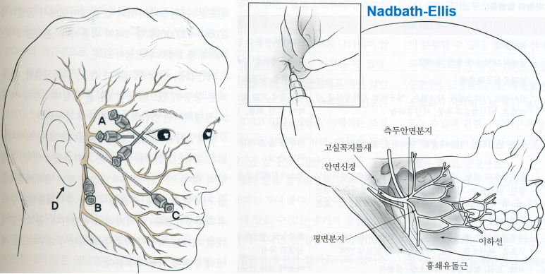 그림 1. 점안각 결막 마취에 자주 사용되는 국소 마취제 3. 마취 방법 백내장 수술 자체의 발달로 인하여 안구 무동(수술 중 눈을 움직이지 않는 상태)의 필요성이 점차 줄어들기는 했지만 환자의 상태에 따라서는 마취가 필요한 경우도 꽤 있다.1) 경피적 안면 신경 마취법 ① Van Lint(그림 2-A) : 외측 안와연(Lateral Orbital Rim)에 있는 최종 신경 분지를 마취 * 단점 : 다량의 안검 부종이 발생할 수 있다.② O’Brien(그림 2-B): 아래턱의 융기돌기(Condyloid process)에 2~3㏄ 주입 * 단점: 불완전한 마취 가능성이 있다.③ Atkinson(그림2-C): 광대뼈 활(Zygomaticarch) 부위에 5-10㏄ 주입* 단점: 많은 양을 주입해야 하며 피하출혈, 불완전 마취일 가능성이 높다.④ Nadbath-Ellis(그림2-D): 아래턱 꼭지(Mastoid process)와 아래턱 가지(Mandibularramus) 사이에 주입㉠의 장점: 빠른 마취 효과, 긴 작용 시간, 높은 성공률, 안검부종의 위험 없음.㉡의단점:경동맥을찌를수있고,영구적인안면신경마비또는영구적인설인두신경㉠