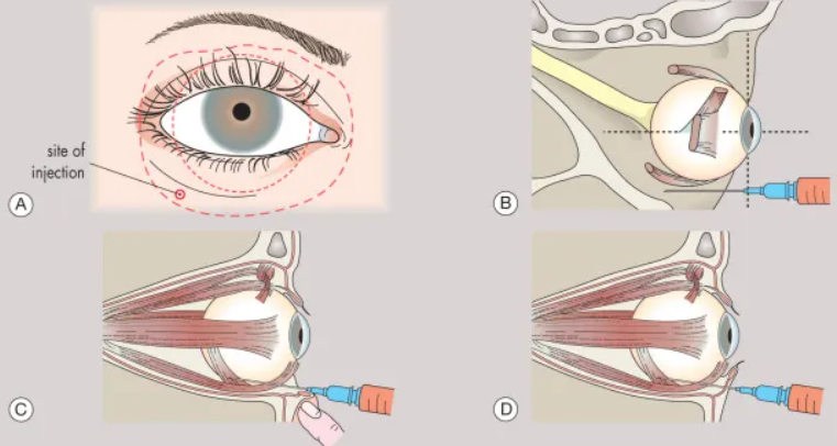 안구 주위(Peribul bar) 마취(그림4) ① 에피네프린을 섞지 않는다.②장점㉠구후마취의 합병증 감소-고도 근시 시 천공의 위험성이 상대적으로 낮다.㉡의 통증이 적고 안구의 움직임이 적다.움직임이적다.세번째,단점㉠발현시간이늦다.㉡ 많은 용량 주입 필요 – 주입 후 안압 상승의 위험 ㅜ 눈가 출혈 및 결막 부종, 눈꺼풀 처짐 발생 가능