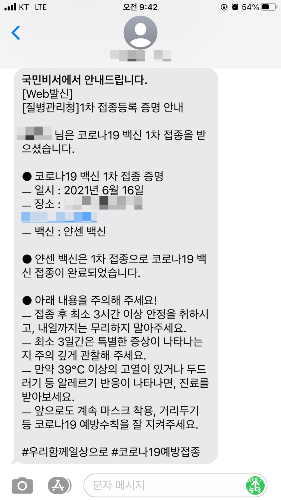 코로나 백신 얀센 접종 후 예약 시 안내받기 위해 선택한 문자나 카카오톡으로 다시 접종 완료 알림이 전송됩니다.