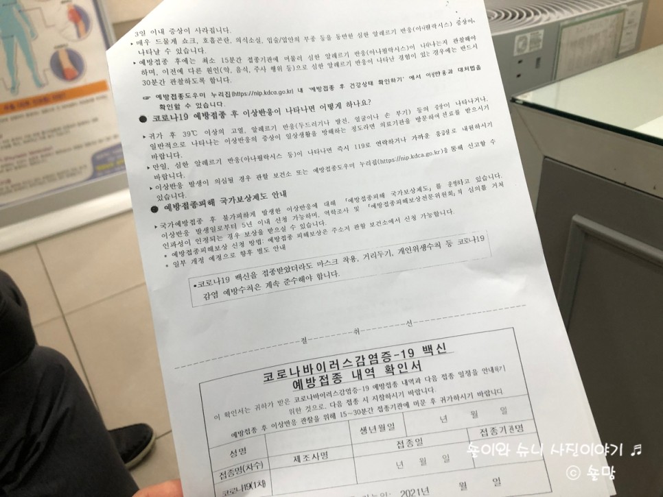 신분증으로 신원을 확인한 후 백신 접종을 위해 간단하게 서류를 작성한 후 혈압을 재고 차례를 기다렸습니다.마지막으로 다시 한 번 간호사에게 기초 질환인지 확인하고 순서대로 진찰실에 들어가 맞았습니다.