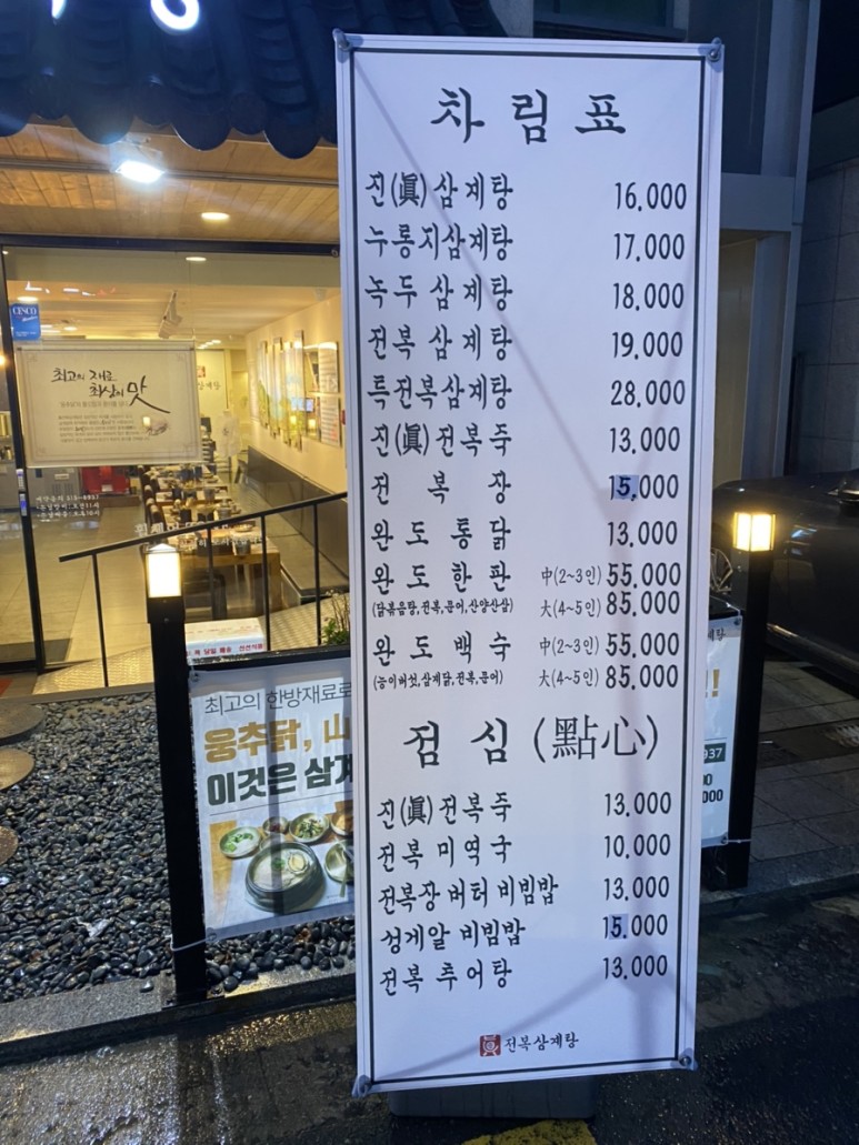 진전복 삼계탕 메뉴!! 강남구청역 점심 먹으러 오시는 분들이 분명 많으셔서 점심 메뉴가 따로 더 있었어요.그리고 완도 전복을 공수해서 파는 집이었어요 몸보신에 최고죠!! 왜 앉았을 때 송가인이 고생했던 스태프들을 데리고 회식하러 왔는지 알겠어요.
