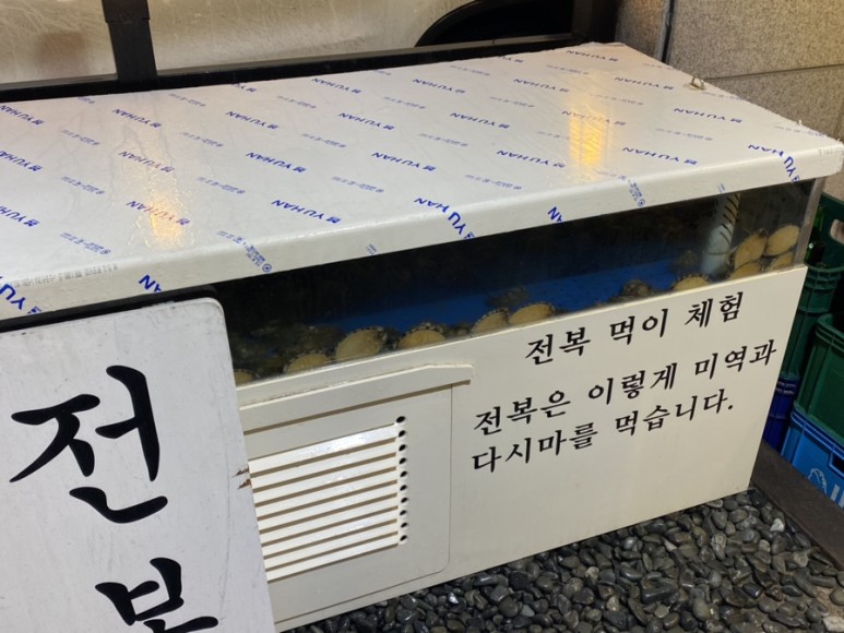 그리고 매장 앞 어항에 위치한 전복 완도에서 왔다고는 하지만 정말 크기가 알차고 알맹이가 없어서 나온 게 조금 아쉽습니다. ( ´ ; ω ; ` )