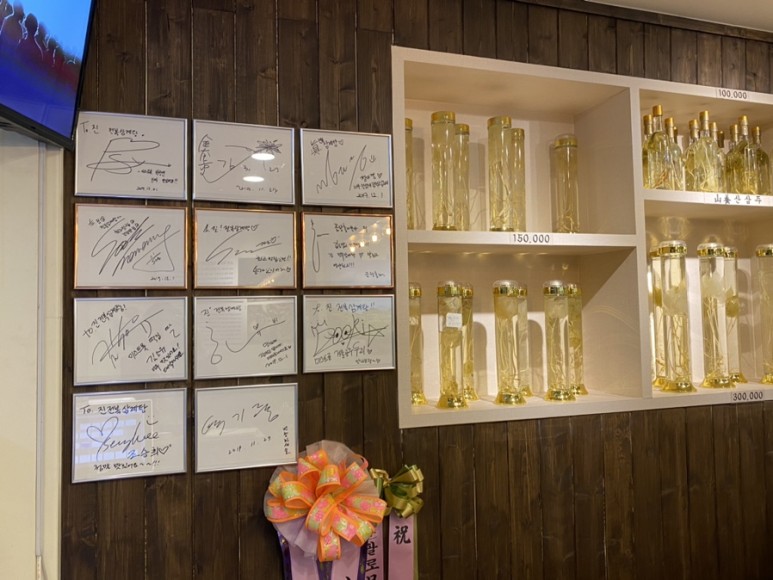 그리고 또 판매되던 상품들이 산삼주!!!! 이 귀한 담근주를 이렇게 보니 산삼주의 퀄리티가 정말 대단했습니다. 그리고 많은 연예인분들이 찾았는지 연예인들의 사인이 많이 붙어있었습니다.하긴 나도 전에 참시의 송가인을 보고 왔으니까