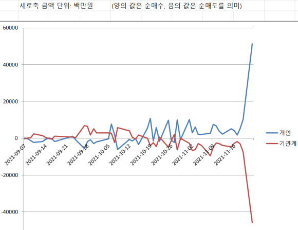 주가가 고점을 찍은 뒤 하락하기 시작한 이유는 매수자의 차익 실현 때문이다. 9월 이후 개인과 기관의 순매수 그래프를 보면 각 기관은 주로 공개 후 매도를 통해 차익을 실현했다는 것을 알 수 있다.