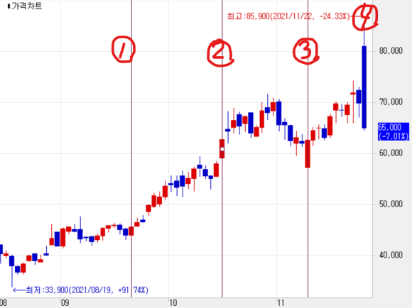 전날 종가:69,900원 당일 시가:81,000원 (전일 종가대비 15.8% 상승) 당일 종가:85,900원 (전일 종가대비 22.9% 상승) 당일 종가:65,000원 (전일 종가대비 7.1% 하락) 고가대비 종가는 24.4% 하락