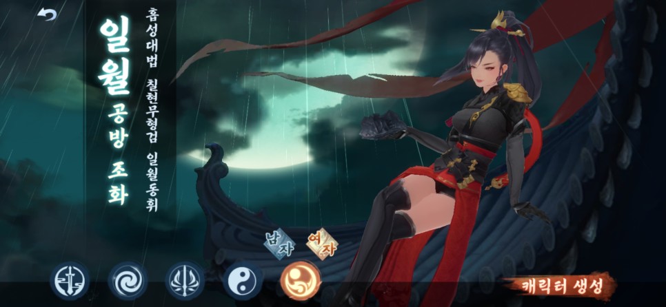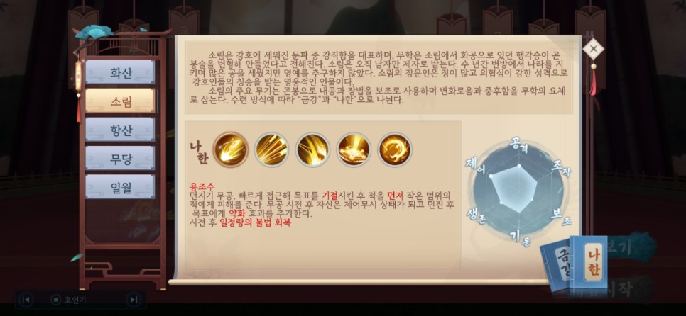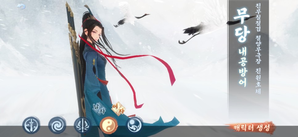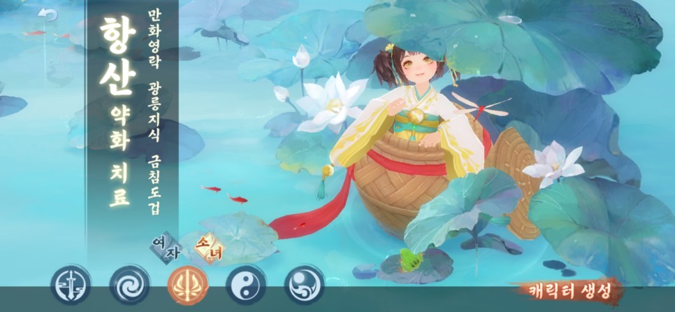직업은 문파라고 해서 총 다섯 가지로 나누어져 있습니다. 그중에서 서림이는 남자만 항상 여자 캐릭터만 가능합니다.