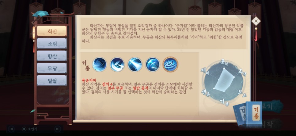 먼저 화산! 화산은 제가 제일 먼저 해 본 문파입니다.화산의 경우 근접 공격이기 때문에 공격할 때 앞으로 나가서 공격을 하는 편입니다.