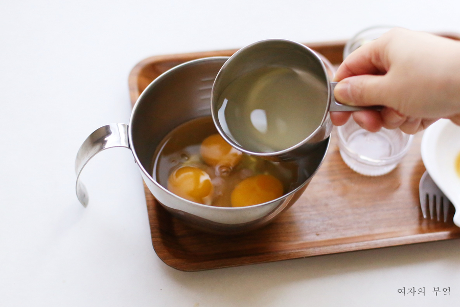 준비한 계란물을 체로 쳐서 체로 친다.이렇게 체를 치면 푸딩 계란찜처럼 탱글탱글하고 부드러운 계란찜을 만드는 방법이 된다.