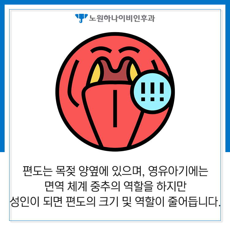 편도는 목젖 양쪽에 있는 구개 편도와 목젖 뒤쪽에 코와 인접한 인두 편도가 있습니다. 편도의 크기는 사람마다 다소 차이가 있지만 일반적으로 나이가 들면서 점차 퇴화하게 됩니다. 영유아기나 청소년기 때는 편도가 면역체계의 중추를 담당하는 역할을 하지만 자라면서 편도의 크기와 역할도 작아집니다. 간혹 성인이 되어서도 편도염이 줄지 않았을 경우 편도염을 유발하는 편도염이 될 확률이 높아집니다.