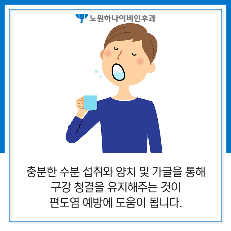 편도염을 예방하기 위해 충분한 수분 섭취와 구강위생을 유지해 주는 것이 좋습니다. 물을 마실 때는 너무 차갑거나 뜨겁지 않은 미지근한 물로 조금씩 자주 마시는 것이 도움이 됩니다. 또한 가글과 양치질로 구강 청결을 유지해 주면 좋습니다. 또한 주변 환경이 건조해지지 않도록 습도 유지에 신경 쓰거나 환기를 시키는 것이 도움이 됩니다. 편도염열로 불편을 끼쳤다면 저희 병원 하나이비인후과에 방문하시기 바랍니다. 저희 노원하나이비인후과는 7호선 노원역 6번출구 바로 앞 KB국민은행 빌딩 5층에 위치하고 있습니다. 상담 및 문의사항은 02)952-8883 으로 답변드립니다. 노원하나이비인후과 홈페이지에 들어가시면 보다 자세한 내용을 확인하실 수 있습니다. 더 자세한 사항은 하단의 배너를 클릭하여 노원하나이비인후과 홈페이지에서 확인하시기 바랍니다.^^