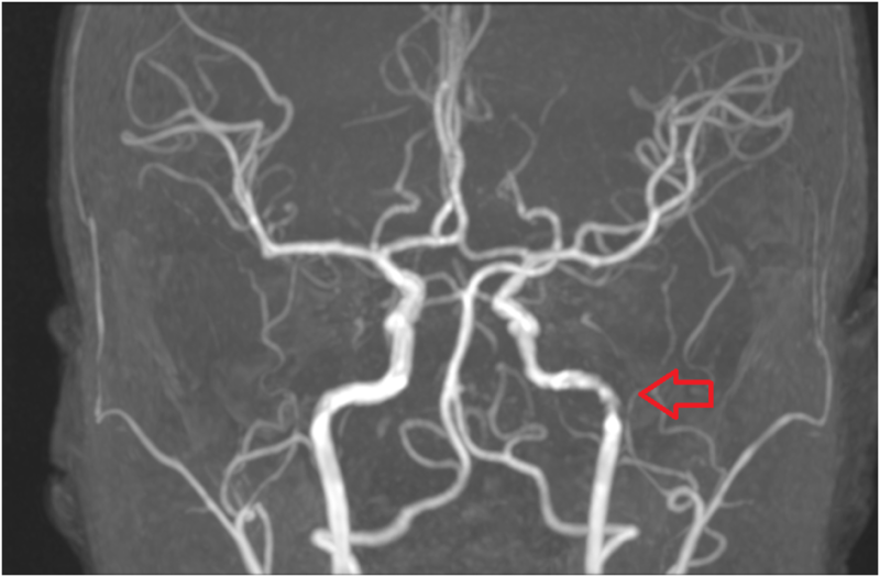 검사결과 #뇌혈관협착(#뇌혈관질환) 빨간 화살표는 왼쪽 뇌혈관이 좁아진 부위를 나타내며 환자의 증상과 일치하여 뇌혈관협착으로 인한 두통으로 확인되었습니다. 환자는 추가 조치(치료, 수술)가 필요한 상황에서 상급병원으로 전원되었습니다.