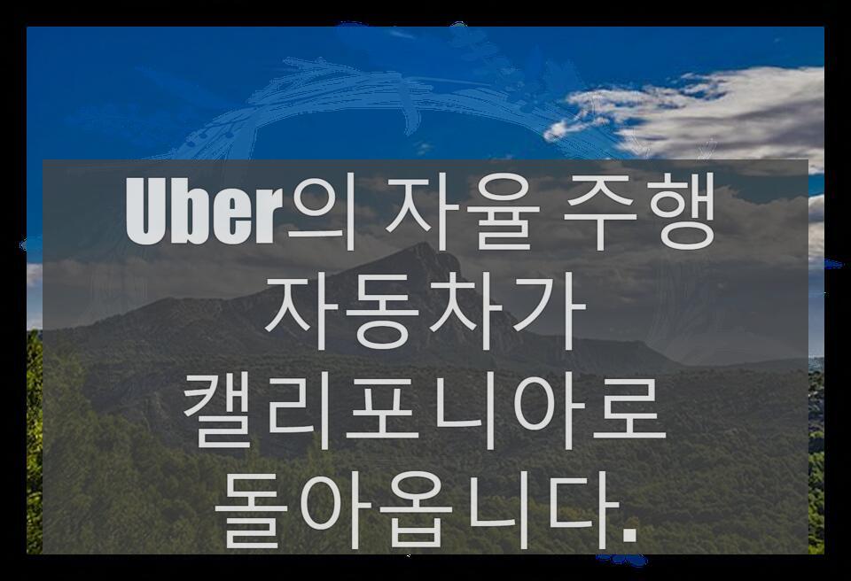 Uber 자율주행 자동차가 캘리포니아로 돌아갑니다.◀글로벌 승차 공유기업 우버의 자율주행 택시가 캘리포니아 주로 돌아온다.지난해 말 캘리포니아에서 자율주행차 사업을 하는 우버는 교통법규를 놓고 캘리포니아 주정부와 분쟁을 빚은 바 있다.이런 마찰로 인해 캘리포니아 당국은 자율주행차를 포기해야만 했습니다.그러나 캘리포니아 주 교통부는 자율주행차 기술 개발 및 상용화에 관한 규정을 완화했습니다.Apocalypse와 달리 보조 드라이버, 스티어링 휠 및 페달 없이 수정되어 작동할 수 있습니다.또 차량 상태를 원격으로 확인할 수 있는 장비와 비상 시 스스로 정지할 수 있는 장비를 의무적으로 설치하도록 했다.또 공공도로 시운전 의무 규정을 1년간 해제하기로 했다.여러 업체가 자율주행차를 개발하는 과정에서 캘리포니아와 논란 끝에 완공돼 2017년 말 실시될 예정이다.이러한 기술개발을 가속화하기 위해 캘리포니아주는 3월 7일 Uber가 주면허와 등록조건으로 자율주행차량을 테스트하고 운영할 수 있도록 허용하기로 했습니다.그러나, 주 당국은 「조만간 뒷좌석의 사람을 승인할 수 없다」라고 하고 있습니다.우버 씨는 캘리포니아에서 실제로 두 대의 자율주행차를 몰고 다니며 자율주행차 상용화를 서두르지 않는다고 말했다.그는 캘리포니아의 안전규정을 준수하는 것이 우선순위가 될 것이라고 덧붙였다.전문가들은 우버의 복귀가 캘리포니아 자율주행차 시장의 경쟁을 더욱 치열하게 할 것으로 보고 있다.2017년 기준으로 웨이모, 테슬라, 포드 등 26개 기업이 캘리포니아에서 자율주행차 시범사업을 벌이고 있다.캘리포니아에서는 또한 스타트업 회사인 플러스아이(Pluseye)를 위해 자율주행차 테스트를 허용하고 있습니다.또 캘리포니아 당국이 자율주행차에 대한 규제를 완화함에 따라 캘리포니아 주에서는 자율주행차 테스트가 더욱 활발해질 것으로 예상된다.우리 모두 알다시피 일리노이, 테네시, 조지아 주를 포함한 미국의 다른 주에서도 자율주행차 법안 제정을 고려하고 있습니다.자율주행차, 신원 공유 경제, 논란의 여지가 있는 혁신적인 Uber, 느슨한 규정이 캘리포니아로 돌아왔습니다.