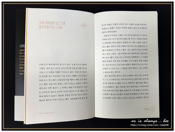 이 책을 일기로 쓰기 훨씬 전, 막연히 생각했던 우주에 대한 이해를 돕기 위해 필자가 2부 즐겨주세요에서 언급한 칼 세이건의 코스모스도 읽으려고 구입했다. 그로부터 한참이 지났지만 여전히 책갈피의 진도는 벽돌책 앞부분에 머물러 있을 만큼 전공도 그렇고 일도 천문학자와는 거리가 멀지만 천문학자는 별을 보지 않는 에세이를 읽으면서 별과 우주에 대한 생각의 거리가 조금은 가까워진 것 같다. 물론 이 책을 다 읽는다고 천문학적인 지식이 커지는 것은 아닌 것 같다. 하지만 필자의 말처럼 우리는 모두 태양계 사람들이라는 사실만은 충분히 이해할 수 있는 느낌이다.[ Hee ]