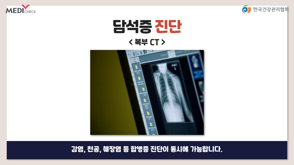 - 복부 CT 담석증이 있는 사람은 없는 사람보다 담낭암 위험이 10배 이상 높습니다. 따라서 초음파 상에서 용종이나 암의 감별이 어려울 수 있습니다. 담낭이 있는 오른쪽 상복부의 늑골을 눌렀을 때에 통증이 있는 경우, 담낭염일 가능성이 큽니다. 전산화 단층촬영은 감염, 천공, 췌장염 등의 합병증으로 진단할 수 있습니다.