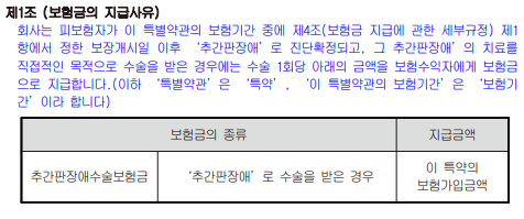 - 담보를 보면요.추간판 장애 치료를 직접적인 목적으로 수술을 받은 경우(수술 1회당) 가입 금액을 지급한다고 나오는데,