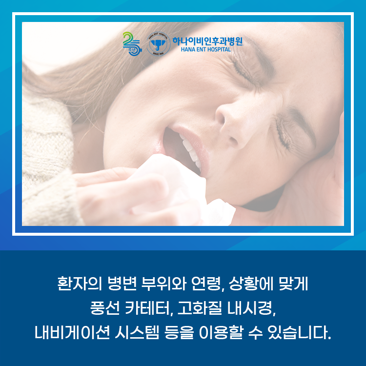 과거에는 잇몸 부위를 절개해 축농증 수술을 했고 통증이 크고 회복에도 오랜 시간이 걸렸는데요. 최근에는 피부 절개가 필요 없는 내시경 수술이 도입되었습니다. 따라서 녹색 콧물이 나는 축농증 수술은 소아, 임산부, 65세 이상 고령 환자에게도 적용이 가능합니다. 환자의 병변 부위와 연령, 상황에 따라 풍선 카테터, 고화질 내시경, 내비게이션 시스템 등을 이용할 수 있습니다.