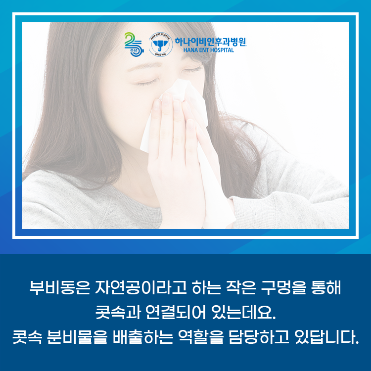 코 뒤에 있는 얼굴뼈 안에는 부비강이라고 하는 빈 공간이 있습니다. 이 공간은 어른 주먹만한 크기로 평소 공기로 채워지면서 머리에 충격을 완화해주는 완충작용을 하고 있습니다. 또한 체외에서 유입되는 공기의 온도와 습도를 조절하여 폐로 보내는 역할을 합니다. 부비동은 자연공이라는 작은 구멍을 통해 콧속으로 연결되어 있습니다. 환기와 콧속의 분비물을 배출하는 역할을 담당하고 있습니다.