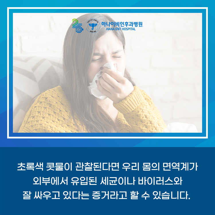 축농증을 앓고 있는 사람 중에서 가끔 녹색 콧물을 발견하고 깜짝 놀라는 사람이 있습니다. 녹색 콧물이 관찰되면 우리 몸의 면역계가 외부에서 유입된 세균이나 바이러스와 잘 싸우고 있다는 증거라고 할 수 있습니다. 외부에서 유해물질이 체내로 유입되면 이를 방어하기 위해 면역물질이 분비됩니다. 면역물질 속에 포함된 백혈구가 제 역할을 한 후 죽으면 녹색 콧물이 나올 수 있습니다.
