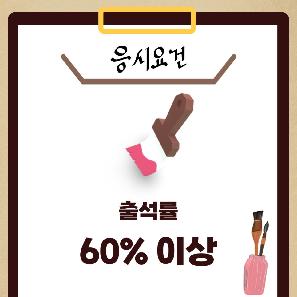 또 민간시험 캘리그라피 자격증 필기시험 참여 선결 조건은 출석률 60% 이상을 충족할 수 있다. 본인이 들을 수 있는 범위 내에서 하루에 2~3개씩 학급에 참여할 경우 11일 이내에 출석률 100%를 만들 수 있다. 다만 그렇지 않은 상태에서 시험을 치러야 할 경우 최소 15강 이상은 들어가야 한다. 전 강좌 수료를 못해도 시험을 치르는 데 불편함이 없고 현수 합격을 하더라도 정해진 점수만 넘으면 되므로 고득점까지는 노리지 않아도 된다.