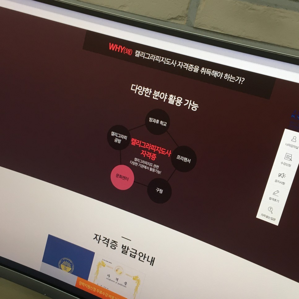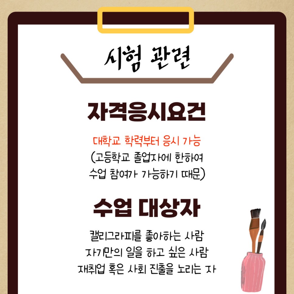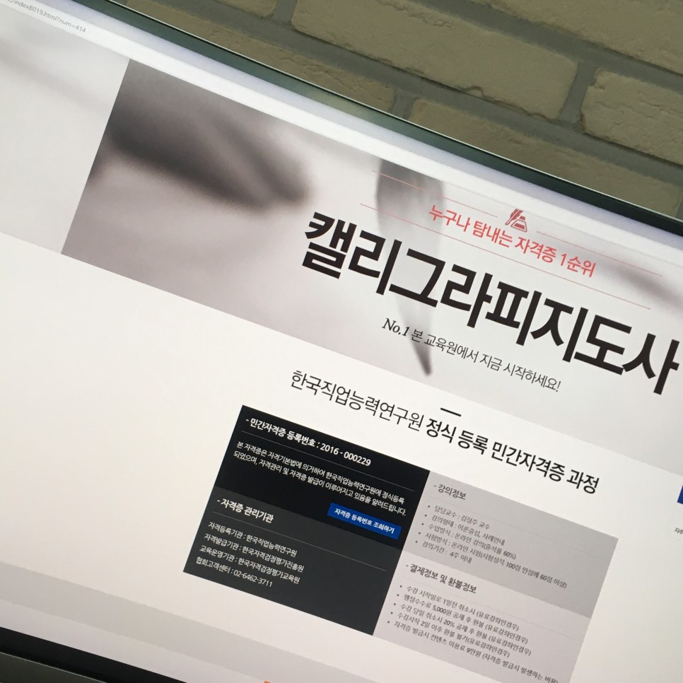 과정을 이수하고 시험을 치른 뒤 본인의 능력을 입증하는 척도로 사용되기 때문에 이 부분도 신경 써야 한다. 캘리그라피 자격증 등록번호는 자격이 사후 지원이 되는 것을 의미하며, 해당 번호가 있어야 발급 및 행정절차, 그리고 취업서류 작성 시 기입 등 실질적인 구직활동을 할 때도 도움이 된다. 그리고 정부 주도 지원 청년 창업 때에도 공방 개장을 위해 준비했다는 자료로도 쓸 수 있다. 따라서 등록번호도 발급받거나 수강 시 반드시 확인해야 한다.