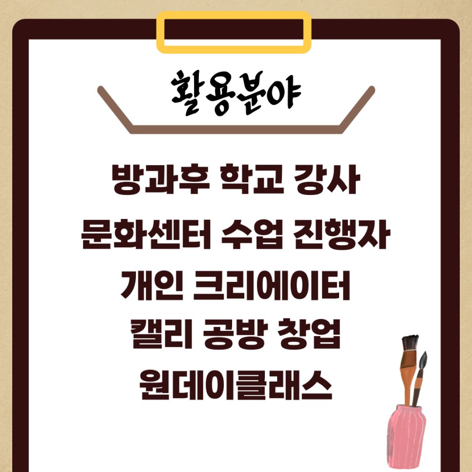 해당 자격증을 잘 활용할 경우 취업 분야 등을 포함한 여러 곳에서 유용하게 사용할 수 있으며 민간 캘리그라피 자격증은 방과후학교나 문화센터, 구청 예술강좌 강사로 취업할 수도 있다. 그리고 경력을 쌓아 자신만의 칼리 공방을 오픈하거나 프리랜서 아티스트로 활약할 수 있으며, 뿐만 아니라 20대가 취득해 소셜미디어 콘텐츠 제작에 사용할 경우 2030이 주로 사용하는 플랫폼에서 능력을 인정받는다. 이를 통해 창작자로 평생 일할 수 있고, 더 발전시킨다면 청년들이 그렇게 원하는 1인 기업인으로 성장할 수 있는 발판으로도 활용 가능하다. 이처럼 해당 자격은 활용 범위가 넓은 편이지만 취득 과정과 응시 자격, 응시 난이도가 높은 편이 아니기 때문에 고등학생을 제외한 전 연령에서 충분히 학습, 취득해 경제활동을 할 수 있다.
