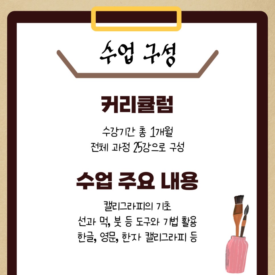캘리그라피 자격 수료과정은 한 달간 25개 이론수업을 수강하게 돼 있다. 첫 수업과 5강까지는 캘리그라피의 기초와 함께 도구를 사용해 판본체 연습과 필압에 따른 연출 변화 등 기본기부터 익히게 되며, 이 수업을 통해 자신에게 맞는 캘리펜의 종류가 무엇인지 알 수 있다. 앞으로 자신의 작품의 완성도를 높일 수 있는 도구에 대해 탐구하고 실력을 쌓게 되며 7회차부터는 글꼴 변화 주기, 기울기, 먹쓰기, 포인트와 느낌 효과적으로 주기, 10개 선 등 예술적인 연출 이론과 실제를 수강하게 된다. 수강생의 실력이 늘어나는 시점부터는 북 리뉴얼, 글 연습, 장문 쓰기 등으로 예술성과 정확성을 높이는 고도 실습 단계가 시작되며, 이 과정을 통해 한글을 예술적으로 쓰는 것을 종합적으로 배우게 된다.