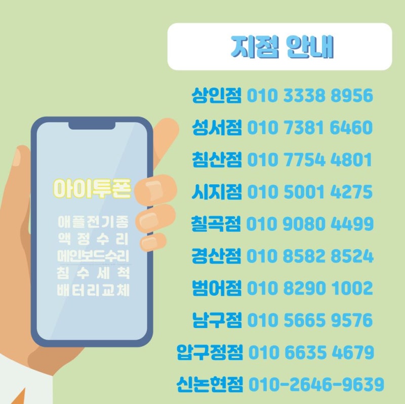그리고 가격도 저렴하니 저처럼 비용을 줄이고 싶다면 애플웍스에 가서 문의하세요.시설도 좋고 정품 수리에 투명해서 문제없습니다.사설이지만 신뢰할 수 있는 업체로 대구 지역에 여러 곳이 분포하고 있기 때문에 어느 지점을 가든 똑같이 as를 받을 수 있습니다.시설도 좋고 정품 수리에 투명해서 문제없습니다.사설이지만 신뢰할 수 있는 업체로 대구 지역에 여러 곳이 분포하고 있기 때문에 어느 지점을 가든 똑같이 as를 받을 수 있습니다.칠곡 아이폰수리 애플웍스 대구광역시 북구 영송로 54 1층 휴대폰대구 북구 영송로 54 대구과학대학정문 바로앞 010 36059876 카카오톡상담 as79#칠곡아이폰수리#칠곡아이폰수리