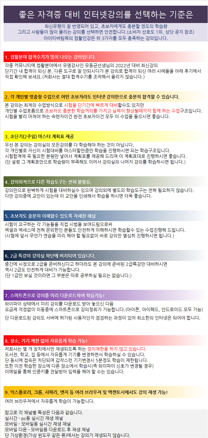 ㅇ후기 – 본인은 사회초년생으로 엑셀을 꽤 사용해 엑셀 사용에 익숙하다.- 그런데 시험에서는 ‘매크로’, ‘피벗 테이블’, ‘부분 경우’ 등 평소 들어보지 못했던 기능도 사용해야 해 난항을 겪었다.- ‘매크로’ 등 어색한 기능 문제는 실제로 풀어보면 30초 이내에도 정답을 맞힐 수 있다.- 그런데 ‘논리함수’처럼 평소 자주 쓰던 기능 문제가 오히려 시간이 많이 소모될 가능성이 높다.- 20분 만에 모든 문제를 푸는 정도까지 끊임없이 반복하다 보면 합격할 수 있을 것이다.