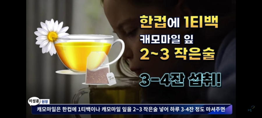 카모마일은 컵 한 잔에 1티백이나 카모마일의 잎을 2~3작은술 하루 3~4잔 정도 마시면