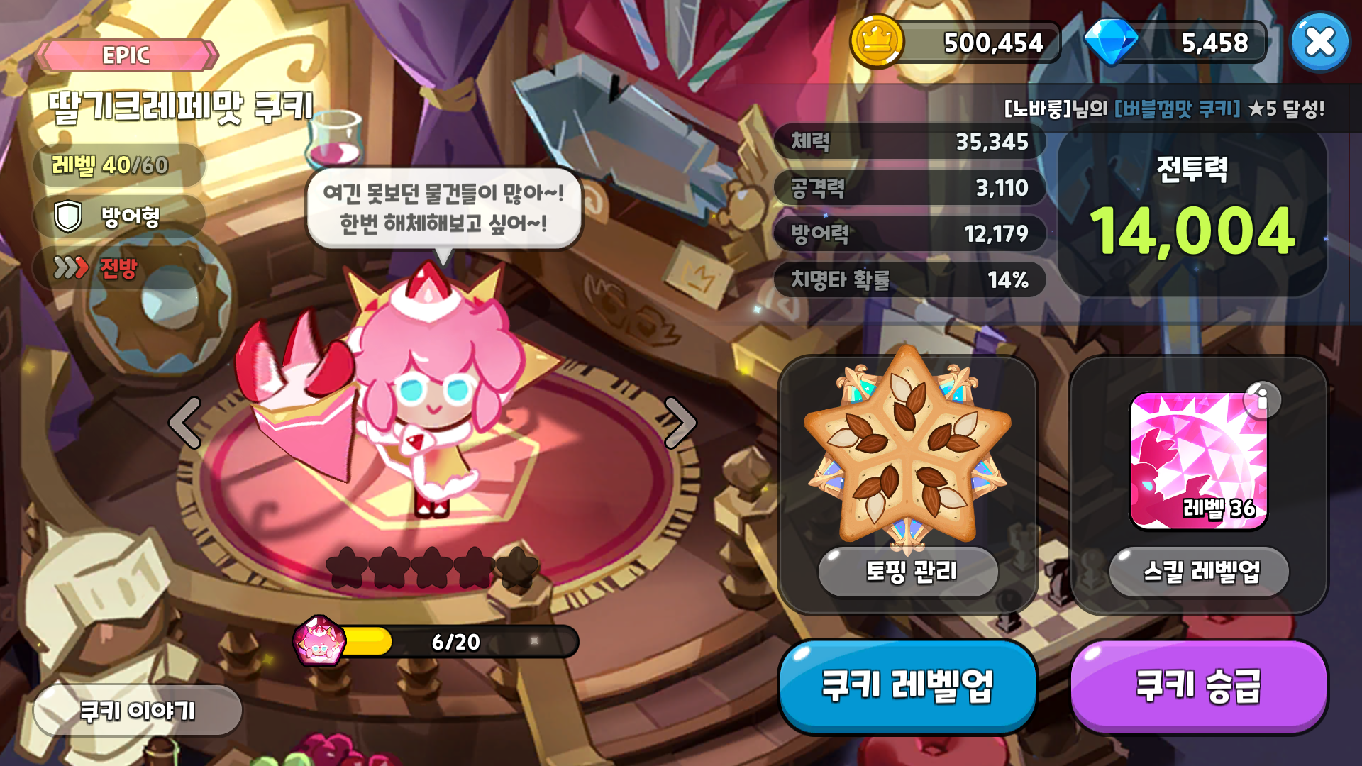다만 소닉쿠키는 성능이 그리 뛰어나지 않고 단순히 수집용으로만 한 칸을 차지하고 있는데 이번에 출시한 BTS쿠키는 정말 대단한 성능을 가지고 있습니다.현재 아레나에서 찰스 쿠키와 함께 0티아 적폐조합으로 구성되어 있기 때문에 일단 꼭 빼고 키워야 할 쿠키입니다.