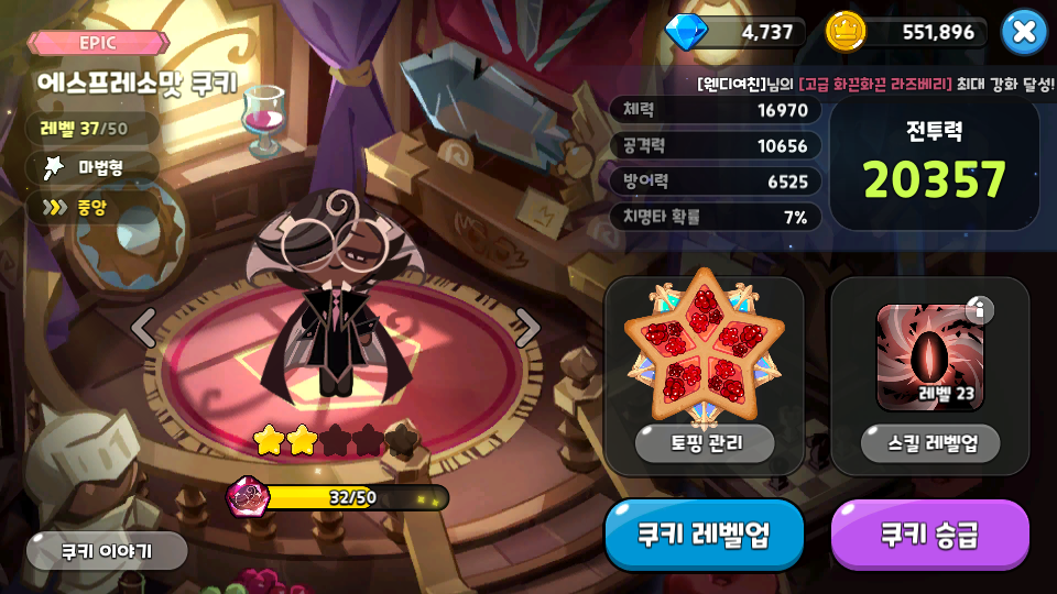 이후에는 BTS 쿠키는 스페셜 쿠키 뽑기로만 획득할 수 있습니다. 그러니까 추가로 별급을 업그레이드 하고 싶다면 과금이 거의 필수라고 보시면 됩니다.물론 시간을 두고 퀘스트를 클리어하면서 뽑기로 가져갈 수도 있지만 7명의 BTS 쿠키가 있는 이상 중복해서 뽑기는 상당히 어려울 것 같습니다.