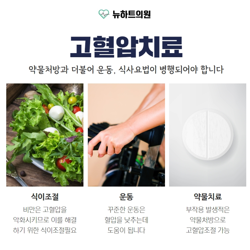 부산뉴하트의원에서는 고혈압약만 처방하지 않고 식사조절, 체중조절, 금연, 대사증후군 치료, 말초혈관장애 치료 등 고혈압으로 인해 불편해지는 부분을 관리하고 고혈압 문제를 줄이기 위한 다양한 관리에 대해 지도하여 안내하고 있습니다.