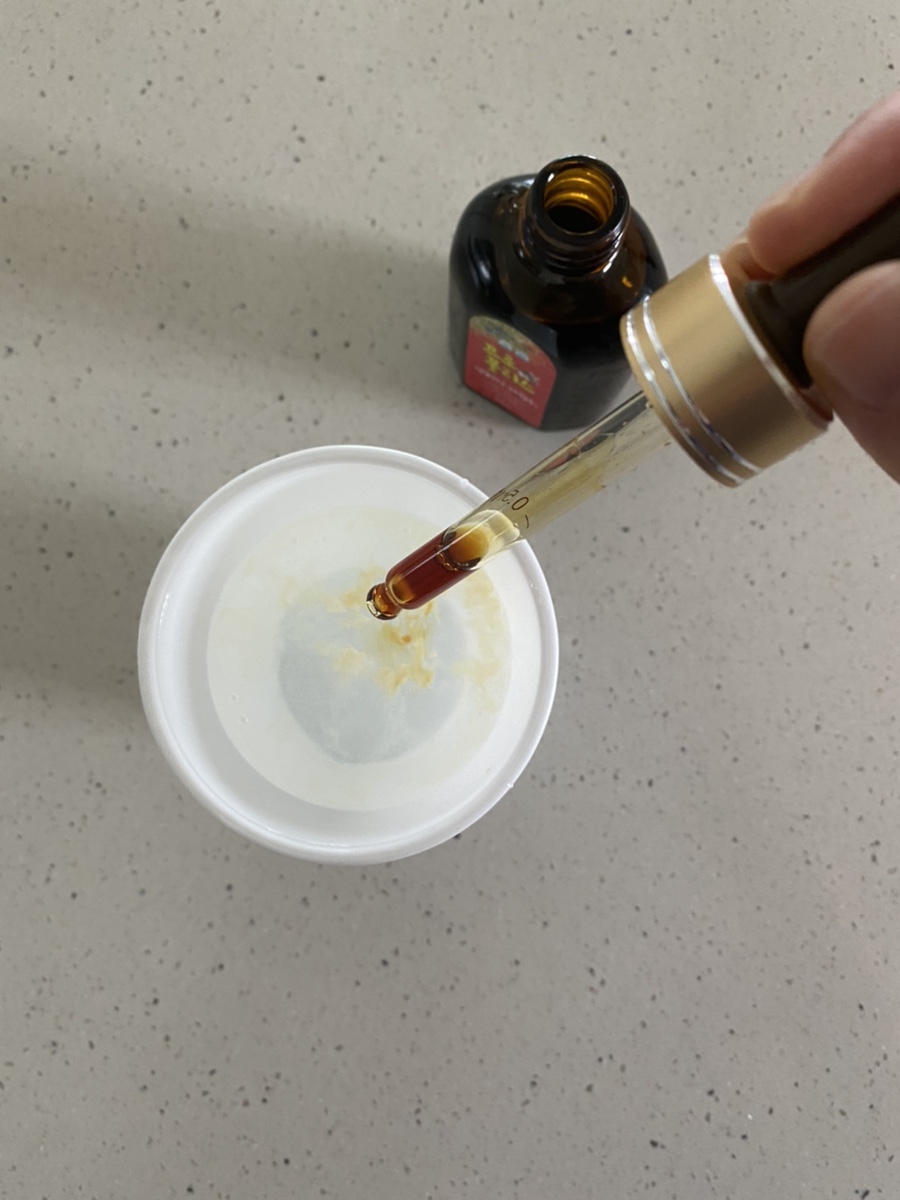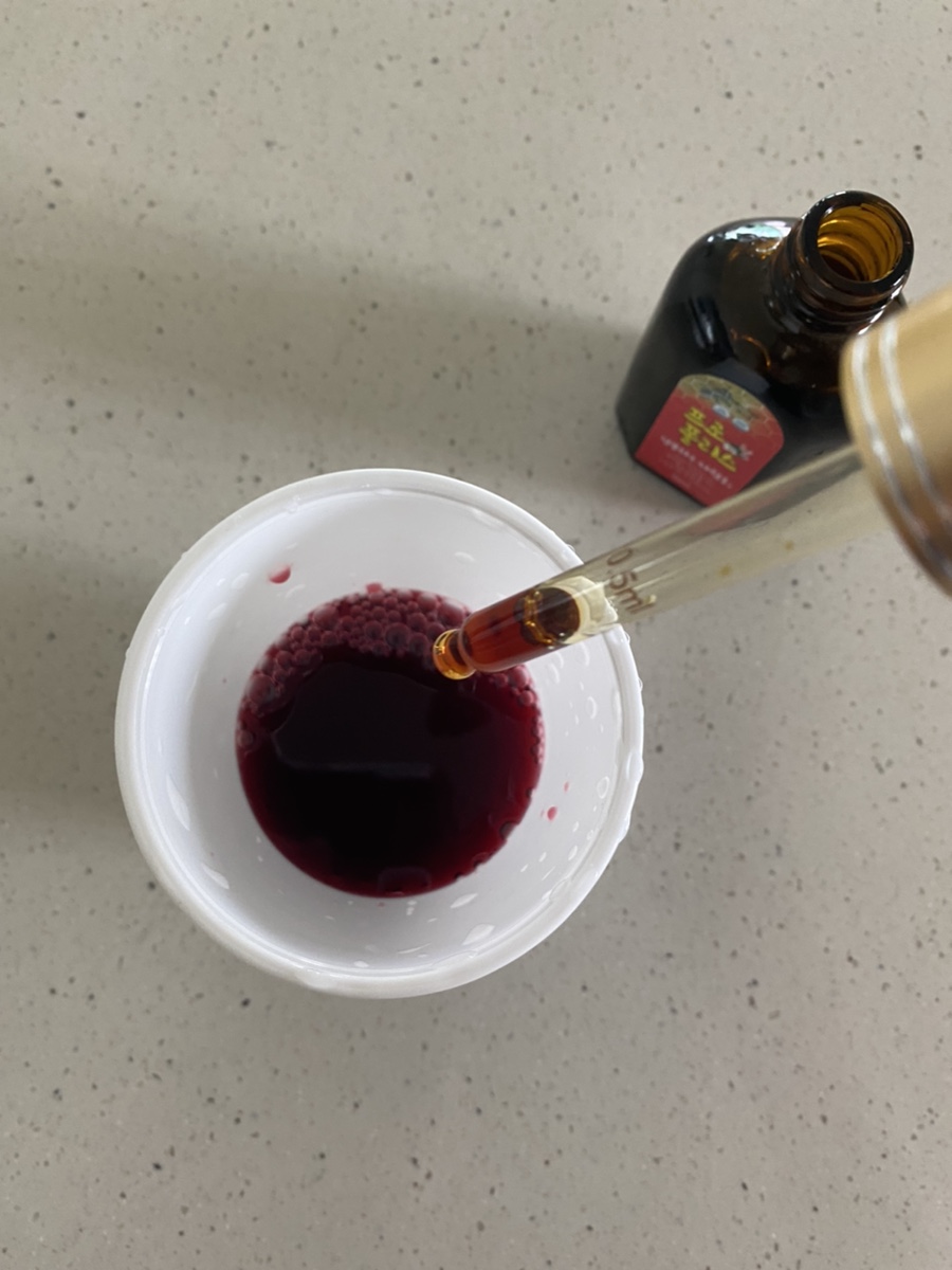 한 방울 두 방울 떨어뜨리면 짙은 갈색인데 이렇게 노랗게 색이 변합니다구강으로 섭취해도 색깔은 변하거든요.편도염 수술하기 직전까지 갔는데 프로폴리스가 좋다는 말을 계속 복용해서 편도염은 최근 1년간 생기지 않았기 때문에 편도염에 좋은 음식으로 꼭 추천합니다!