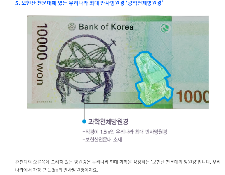이 책의 저자 전영범 천문학자가 직접 찍은 보현산 천문대의 망원경 사진은 1만원권 뒷면에 실려 있다. 이것에 대한 이야기로 책을 시작할 정도로 작가에게는 의미 깊은 사건이었고, 읽는 독자에게도 의미 깊은 사건인 1만원짜리 사진 투입ㅋㅋㅋㅋㅋ 살아가면서 내가 찍은 사진이 한국에 유통되는 돈에 실리게 된다면 그만한 영광은 없을 것이다.보현산천문대 망원경 1만원권을 사용해 검색했더니 기업은행에서 자료를 정리해 놓은 것이 보여 함께 소개해 본다.책에 따르면 보현산천문대의 망원경은 한국의 최대 망원경이라는 의미도 있지만 설치 과정에서 한국의 기술이 많이 사용됐기 때문에 외산망원경이긴 하지만 거의 우리가 만든 망원경이라고 할 만하다고 한다. 거의 다 떼서 설치했대 크크크크
