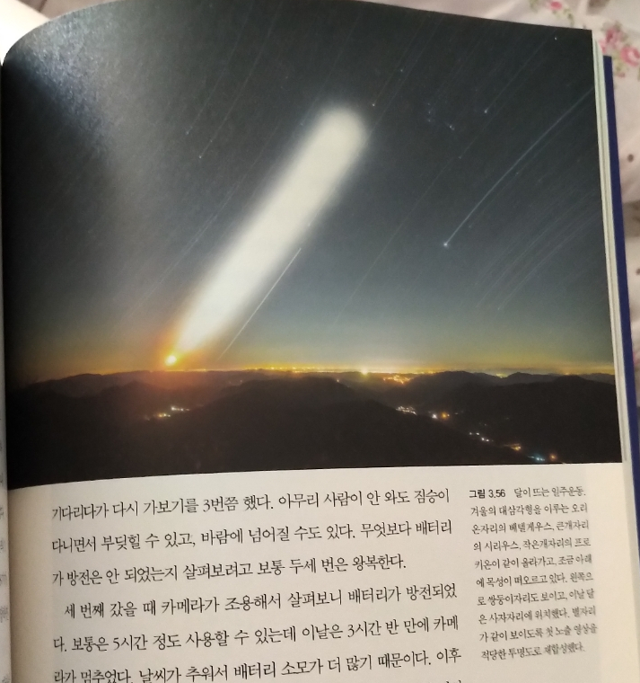 긴 노출로 별이 움직이는 책에 따르면 흐르는 사진도 많이 실려 있다. 별이 흐른다는 표현이 너무 좋았다. 실제로 천문사진가들 사이에서 쓰이는 말인지 책에 이 표현이 자주 나오는데 아, 다행이네요.위 사진에서 가장 빛나고 있는 것이 달이라고 한다. 실제로 달이 너무 밝으면 별다른 관측이 안 될 정도여서 달의 밝기를 짐작할 수 있다. 나도 원래는 태양이 밝아서 달은 어두울 줄 알았는데 1년 전 강원도 별마로천문대에 가서 망원경으로 달을 들여다보고 그 생각이 완전히 사라졌다 ㅋㅋㅋㅋㅋㅋㅋㅋㅋㅋ 별에서 천문대에서 달, 목성, 토성 세 개를 망원경으로 볼 수 있었지만 목성과 토성은 너무 작아서 집중해서 볼 수 있었다면 달은 망원경으로 볼 수 있을 만큼 아프게 맞히기 전이라면 달은 망원경으로 볼 수 있었다. 그 정도로 밝고 커서 참 신기했던 경험이 있다. 그 달이 작가님이 찍은 사진으로는 그냥 터질듯 존재감 뿜뿜ㅋㅋㅋㅋㅋㅋㅋㅋㅋㅋㅋㅋㅋㅋㅋㅋㅋㅋㅋㅋㅋㅋㅋㅋㅋㅋㅋㅋㅋㅋㅋㅋㅋㅋㅋㅋㅋㅋㅋㅋㅋㅋㅋㅋㅋㅋㅋㅋㅋㅋㅋㅋㅋㅋㅋㅋㅋㅋㅋㅋㅋㅋㅋㅋㅋㅋㅋㅋㅋㅋㅋㅋㅋㅋㅋㅋㅋㅋㅋㅋㅋㅋㅋㅋㅋㅋㅋㅋㅋㅋㅋㅋㅋㅋㅋㅋㅋㅋㅋㅋㅋㅋㅋㅋㅋㅋㅋㅋㅋㅋㅋㅋㅋㅋㅋㅋㅋㅋㅋㅋㅋㅋ