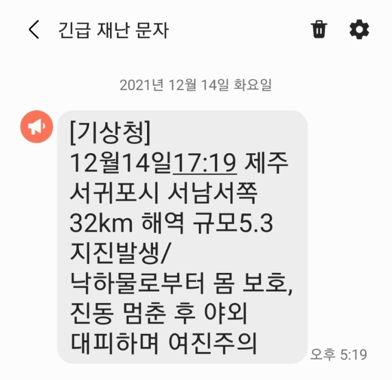 12월 14일 오후 5시 19분 제주 서귀포시 서남서쪽 32km 해역에서 리히터 규모 5.3의 지진이 발생했다는 긴급 재난 문자였다.