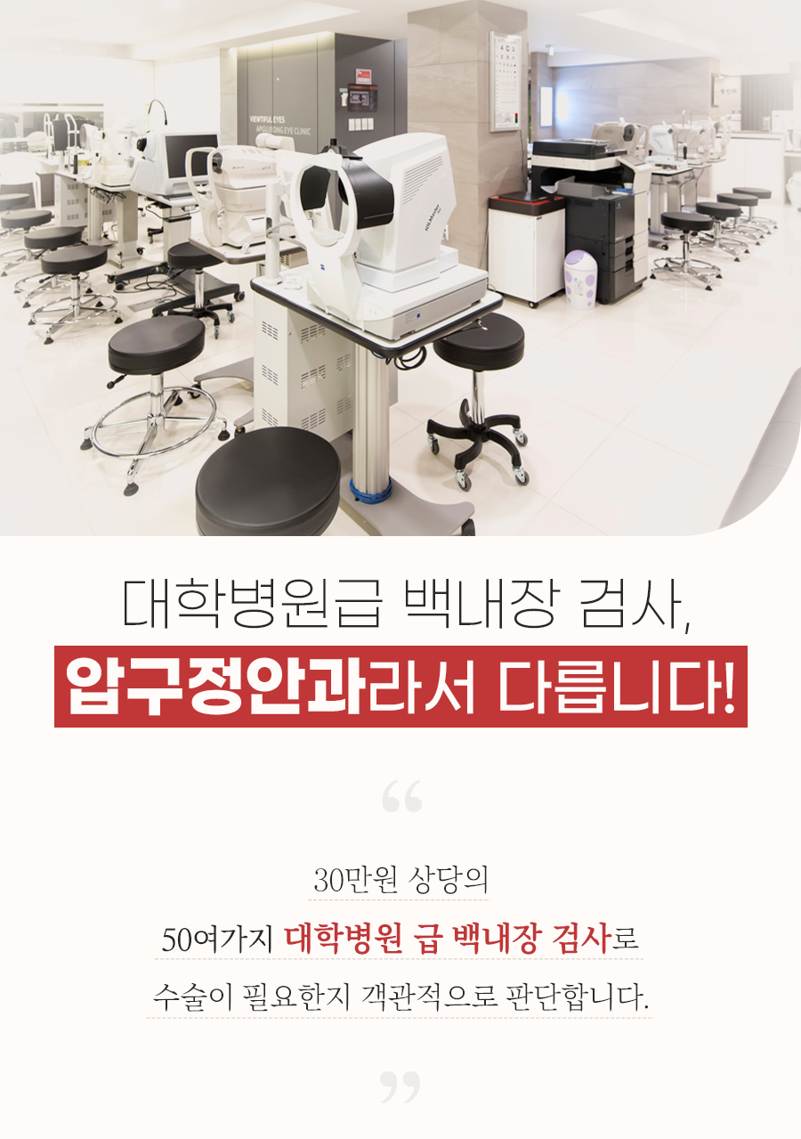일반적인 시력교정술과 달리 기존의 수정체를 제거하고 새로운 인공수정체를 삽입하는 난이도가 있는 과정에서 이루어지기 때문에 각막부터 수정체, 망막 등 전 분야에 걸쳐 의료진의 기술력이 안구 전반을 다룰 수 있는 실력을 갖춘 의료진을 선택해야 했습니다. 노안이나 백내장은 진행될수록 불편함도 커질 수밖에 없기 때문에 가능한 한 신속한 진단과 치료가 중요했습니다. 따라서 이를 방치하지 말고 신속하게 내원하여 맞춤형 치료계획을 세우고 시력개선을 경험하십시오.